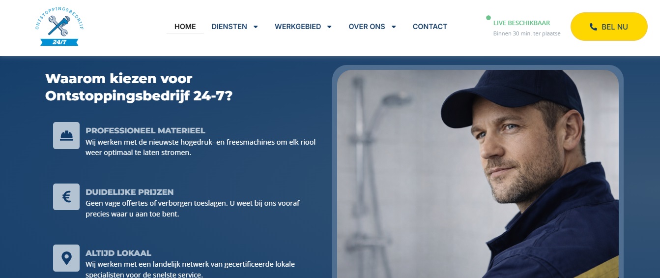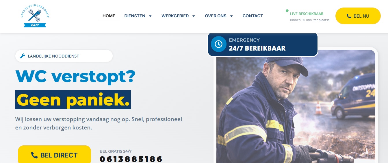 Designed and structured a fully conversion-focused website for a 24/7 emergency drainage service company in the Netherlands. The website was built to convert urgent visitors into immediate phone calls through clear CTAs, high-visibility phone placement, emergency-focused messaging, and structured user flow. I developed the complete page hierarchy including Home, Services, Local Landing Pages, About, Reviews, and Legal pages, ensuring every section supports lead generation and trust-building.