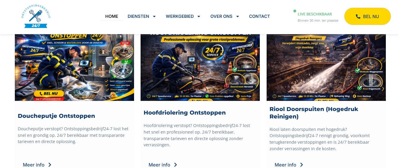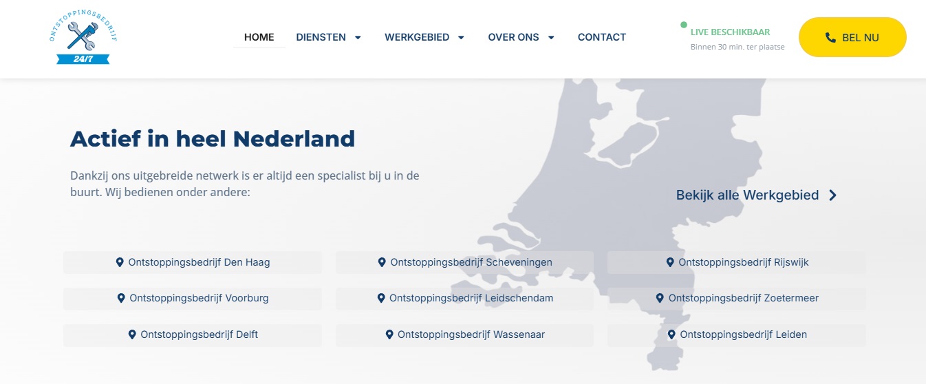 Developed a scalable local SEO strategy targeting high-intent search queries such as “wc verstopt” and “riool ontstoppen + city name.” Created dedicated location pages for multiple Dutch cities with unique localized content to dominate city-based searches. Implemented structured internal linking between services and locations to strengthen topical authority and increase Google visibility.